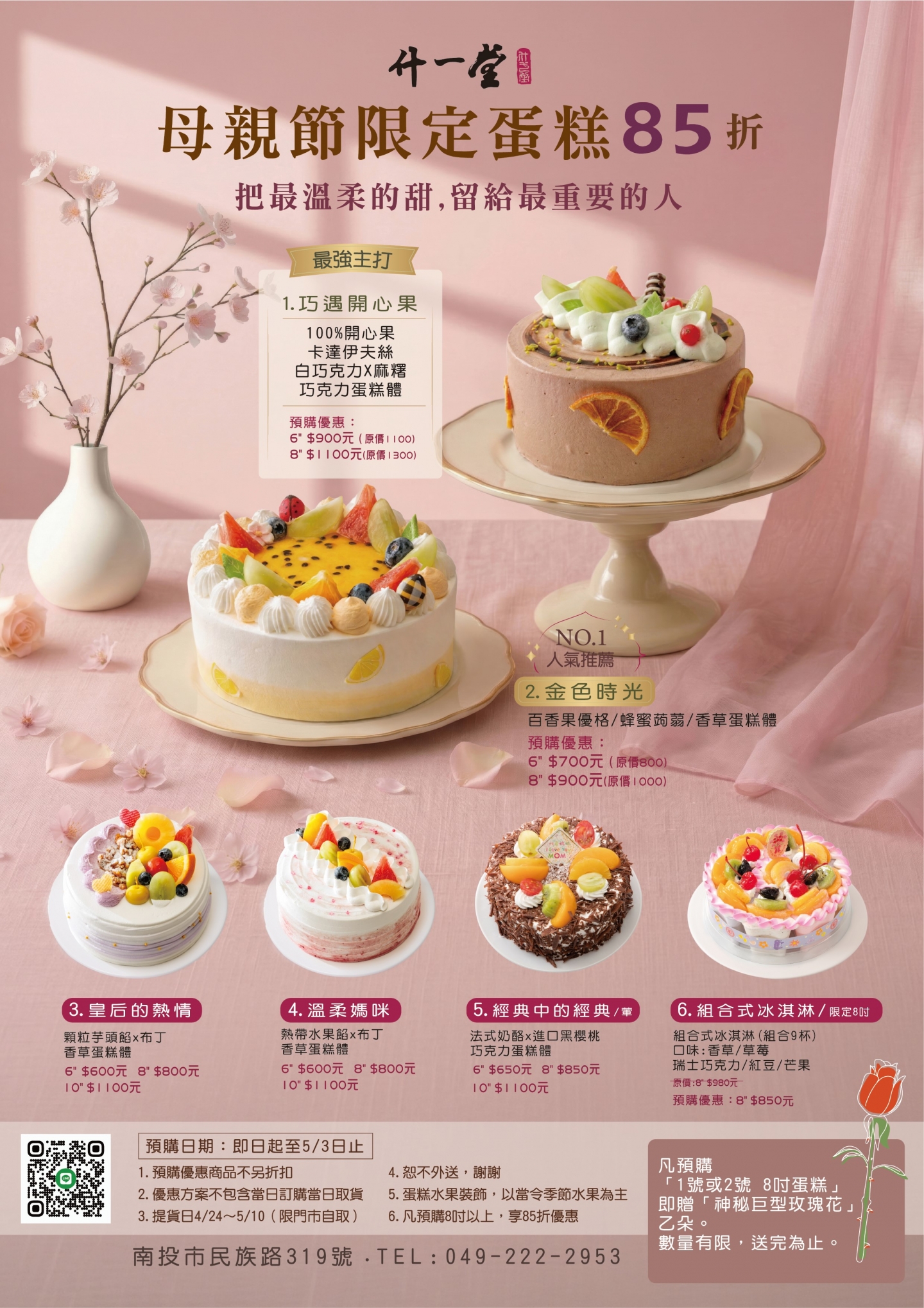什一堂烘焙坊創立於西元1951年,本店以七十多年的專業烘焙經驗, 已在南投地區建立起消費者心目中品牌形象, 從第一代傳統三明治、第二代經典檸檬蛋糕到第三代台灣蝴蝶酥, 代代都有創新產品,也都為本店的暢銷品。 我們的原料嚴謹把關,並且延續每一代的用心,陪您走過半世紀歷史, 期盼這樣的努力,能帶給每位顧客幸福、喜悅的感受, 而您的笑容將是我們什一堂烘焙專業團隊最大的動力來源。